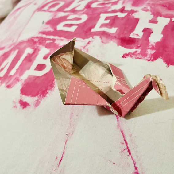 Dankeschön an den oder die unbekannte Falter:in – dieses rosa Symbol für Frieden und Glück hat mich erreicht