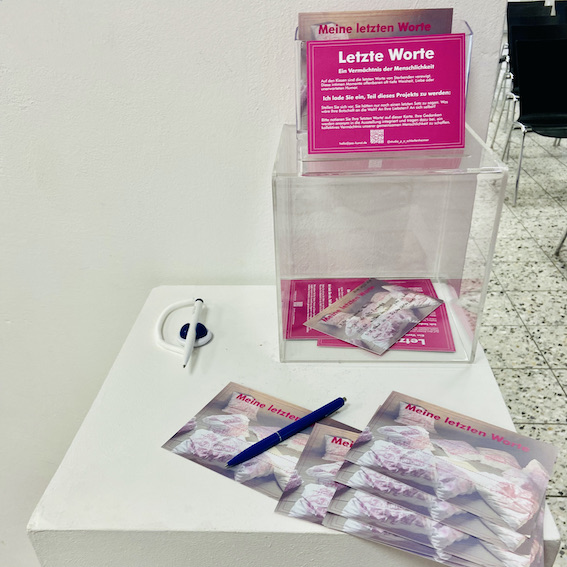 Im Jahr 2025 begann ich, meine textile Raumarbeit LETZTE WORTE um eine weitere Ebene zu erweitern: Seither werden die Besucher:innen durch ein partizipatives Element einbezogen und eingeladen, sich mit der Frage auseinanderzusetzen, welche Worte – irgendwann einmal – ihre letzten sein könnten.