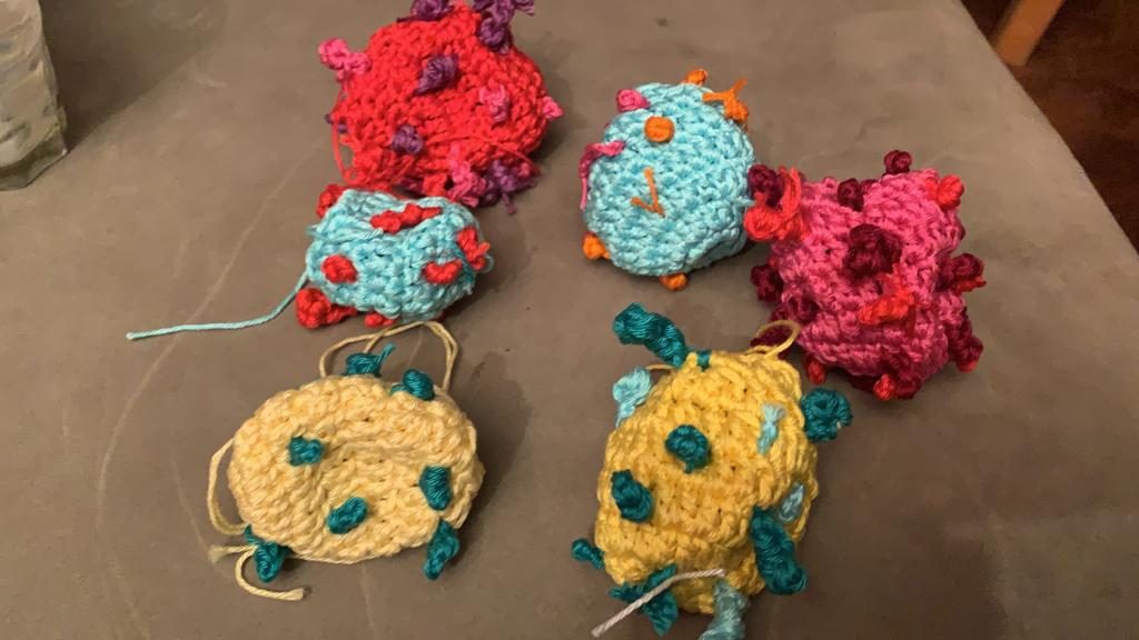 Und dann kamen sie, die Bilder der Viren. Auf allen Kanälen. In Dunkelrot, Orange, Gelb, Violett. Neue Wolle musste her. Sofort! Und jetzt werden keine geordneten Grannys mehr gehäkelt, sondern kleine, fast schon hinterhältige Provokateure, von denen manche so harmlos ausschauen, dass sie fast zum Kinderspielzeug taugen. Schon über zwei Wochen werden Wollknödel mit Krönchen produziert. Viren. Virusse mit kleinen Rüsselchen. Was uns da in diese besondere Lebensform zwingt, hat Gestalt und Ausdruck!