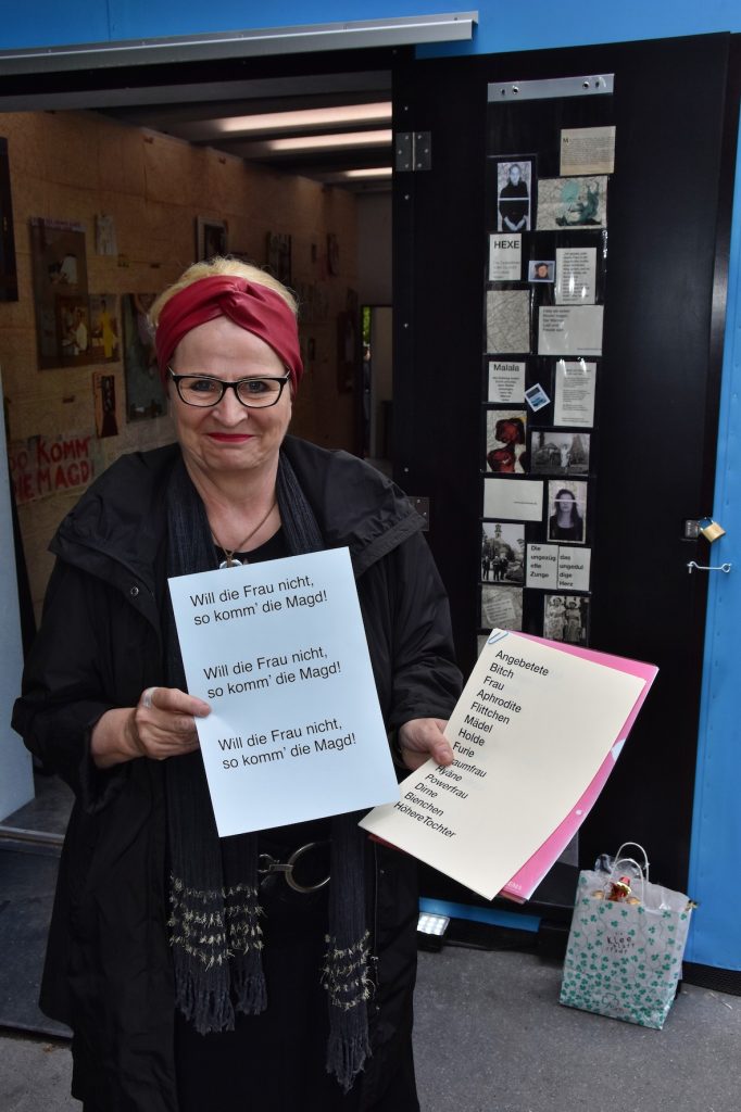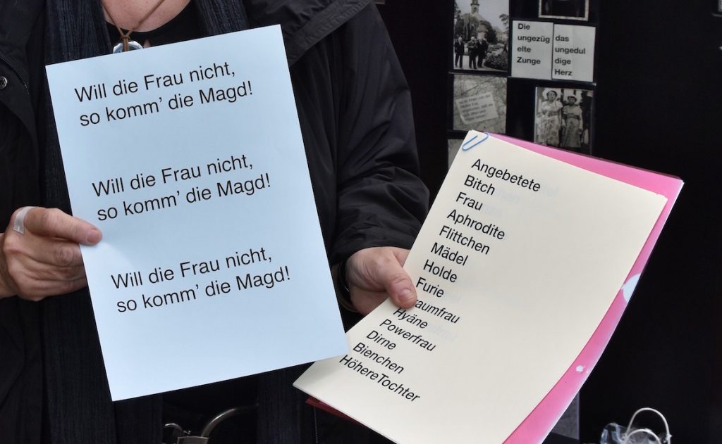 Für Widersprüchliches in Wort und Bild nutze ich das Medium der „Flugschrift“, mit dem sich Argula von Grumbach als erste Frau überhaupt beschäftigte. Als begleitende Arbeit erscheinen meine Frauen-Fluch-Blätter „Der neue Schnitt“.