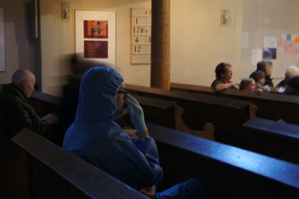 Performance und Intervention mit Blauen Handschuhen in der Auferstehungskirche Fürth