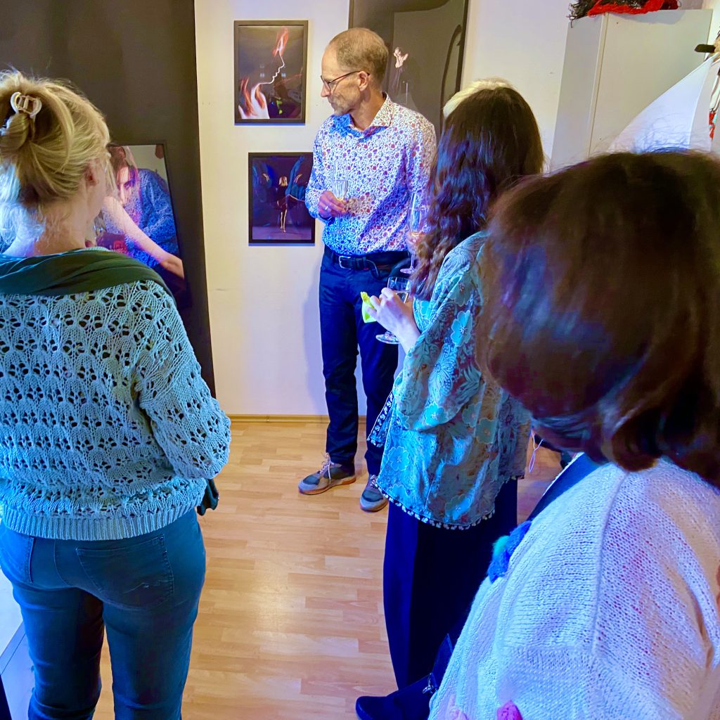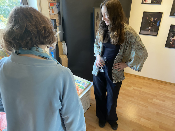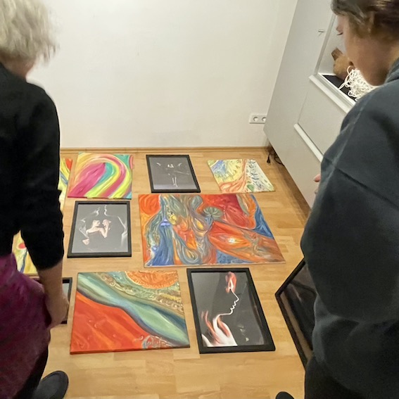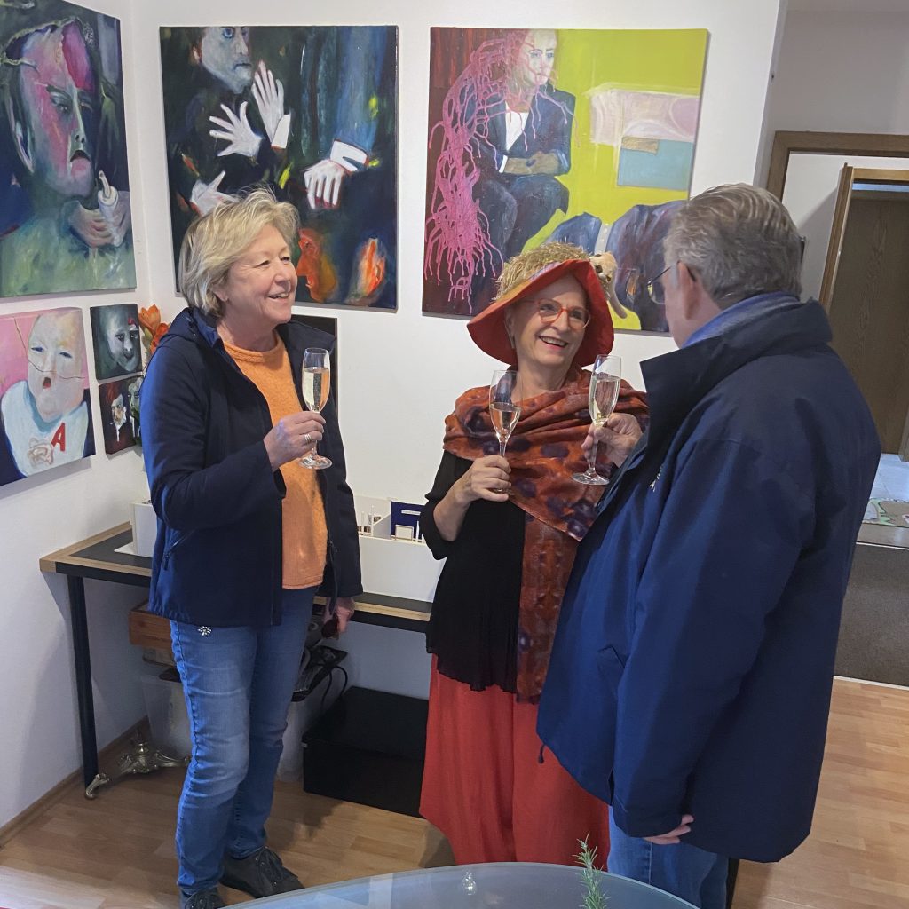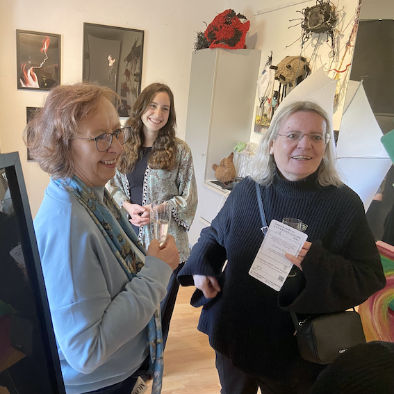 Gespräche entstanden über unsere ganz unterschiedlichen Arbeiten und Arbeitsweisen. Die textilen Kunstkragen von Christiane ten Hoevel wurden ausprobiert, diskutiert und wechselten anschließend die Besitzerinnen, genauso die emotionalen Gemälde von Melissa Osmanovic.
