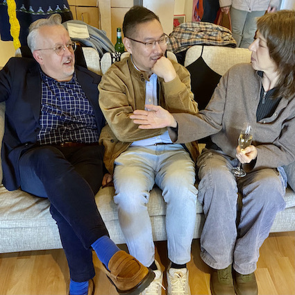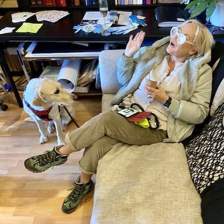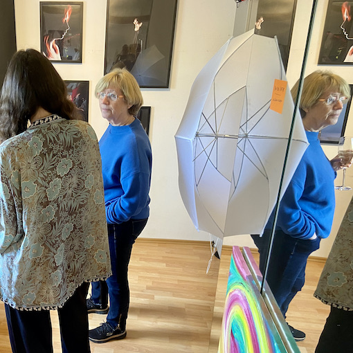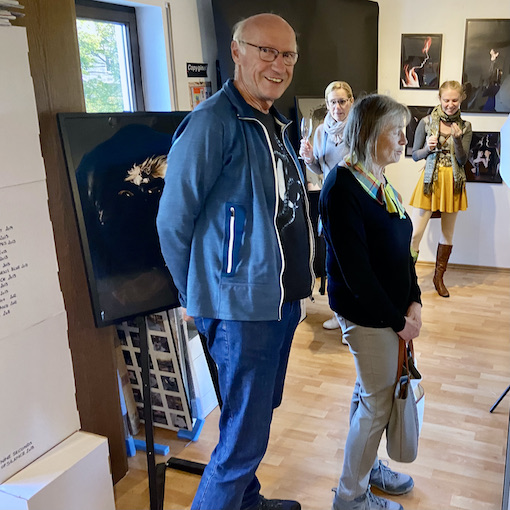 Aber nicht nur über Orte, Stile und Disziplinen hinweg verbindet das GASTSPIEL der Fürther Künstler und Künstlerinnen, sondern auch Menschen, die sich noch niemals vorher begegnet sind. So war unser jüngster Gast knapp über zwei Jahre alt, unser ältester bereits über achtzig. Außerdem mischten sich drei blonde Hunde brav zwischen Kunst und Besuchende um dabei möglichst viele Streicheleinheiten zu bekommen.