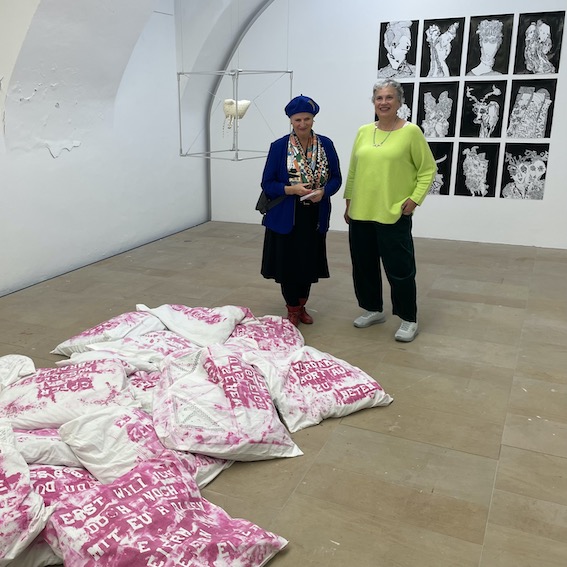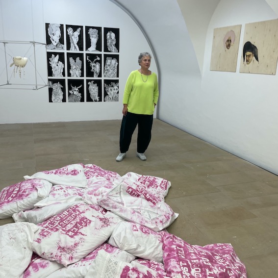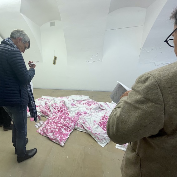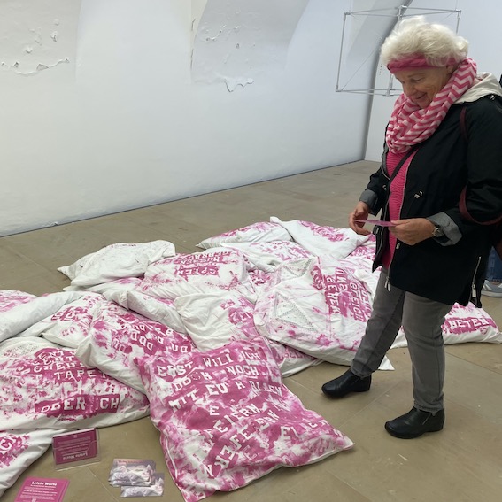 Umgeben von den spannenden Werken meiner Künstler Kollegen und Kolleginnen entstanden intensive Gespräche mit den Besucher:innen über meine 23 am Boden arrangierten Paradekissen – über die Herkunft der Zitate, Farbwahl und Drucktechnik. Solche Begegnungen machen Kunst aus Fürth lebendig.