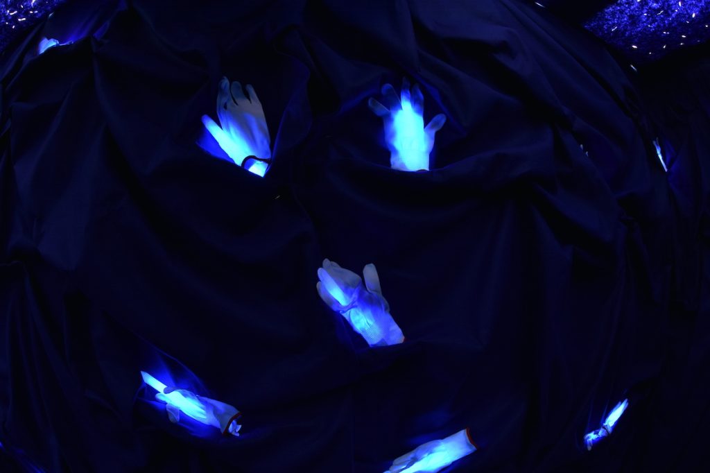 Die temporäre Skulptur, der ReformKiosk, ist während dieses Projektzeitraums komplett mit blauem Filz ausgekleidet. Im völlig abgedunkelten Innenraum entsteht ein gedämpftes Szenario, das nach und nach, von den Besucher:innen durch hunderte leuchtend blauer Handschuhe mystisch illuminiert wird. Der Raum darf lediglich einzeln oder zu zweit betreten werden. Spektakuläre Fotoshootings wechseln sich mit meditativen Minuten ab.