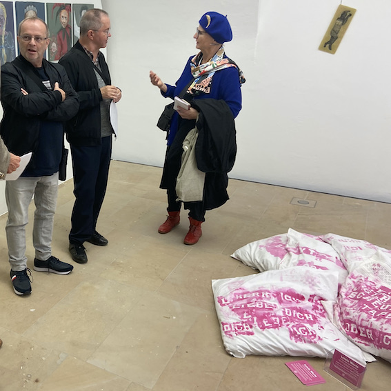 Meine 23 am Boden arrangierten Paradekissen verlockten manche Besucher und Besucherinnen zum Anfassen und die dort ausgelegten Karten mit der Nachfrage: „Was wären Ihre letzten Worte?“ brachten den Einen oder die Andere zum grüblerischen Nachdenken.
