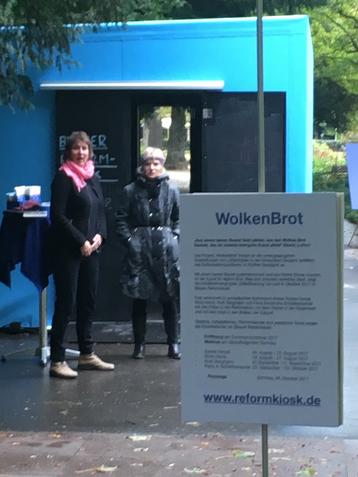 > Den Schlusspunkt unserer künstlerischen Aktivitäten bildeten im Spätsommer / Herbst 2017 unsere vier aufeinander folgenden Einzelausstellungen zum Thema „WolkenBrot“. Meine Temporäre Skulptur, der blaue ReformKiosk im Fürther Stadtpark, war damit zum prominenten Ausstellungsort für vier unterschiedliche künstlerische Positionen der StilleStoerung geworden. Sowohl beim Publikum, wie auch in der Presse, stiess das besondere Format auf reges Interesse, über das wir, Ruth Bergmann, Doris Henle, Sybille Fenzel und ich, uns sehr freuten.