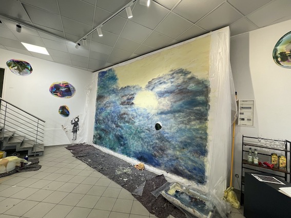 Wie bereits seit ein paar Tagen, arbeitete Sabine auch an diesem Freitagabend auf die Finissage hin, an einem großformatigen Wandbild: malerisch vorbereitet, mit ihren schillernden Fotos kombiniert, ausprobiert, verworfen, neu gedacht. Kreativer Prozess pur – jedoch eben nur noch zwei Tage bis zum Ende der Ausstellung. „Das wird eine lange Nacht …“ vertraute mir Sabine während unseres Gesprächs an.
