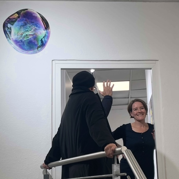 Erfreulich waren an diesem Vorabend des Wochenendes die überraschenden Begegnungen mit der Tänzerin Michaela Pereira Lima und mit Ulrike Manestar im Fürther Kulturlokal. Ulrike ist selbst Fotografin und, als Vorsitzende des BBK Nürnberg / Mittelfranken, weit über die mittelfränkische Kunstszene hinaus bekannt. Mit ihrem fachkundigen Blick ging sie durch die Ausstellung der Seifenblasenbilder von Sabine.