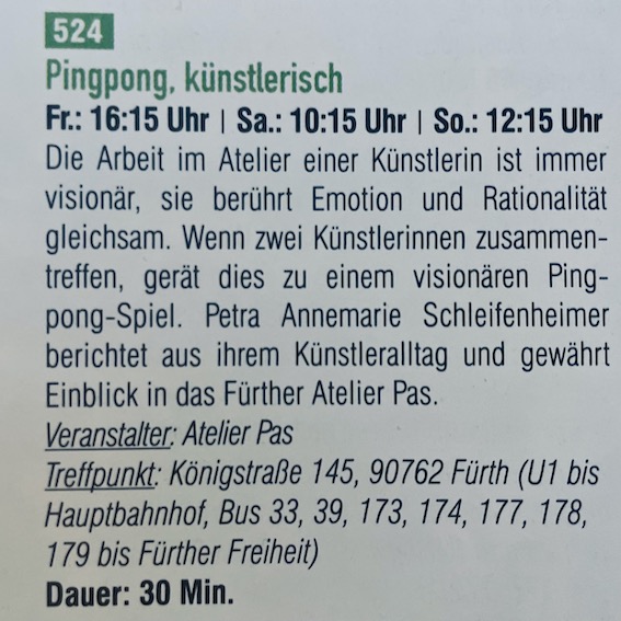 Unter diesem viel versprechenden Titel lade ich Sie, im Rahmen der Stadtverführungen, vom 21. bis 23. September 2018 zum Besuch in mein Atelier PAS zum „PingPong, künstlerisch“ ein. Die Öffnungszeiten finden Sie nachfolgend, sowie im Katalog vom Projektbüro im Kulturreferat der Stadt Nürnberg.
